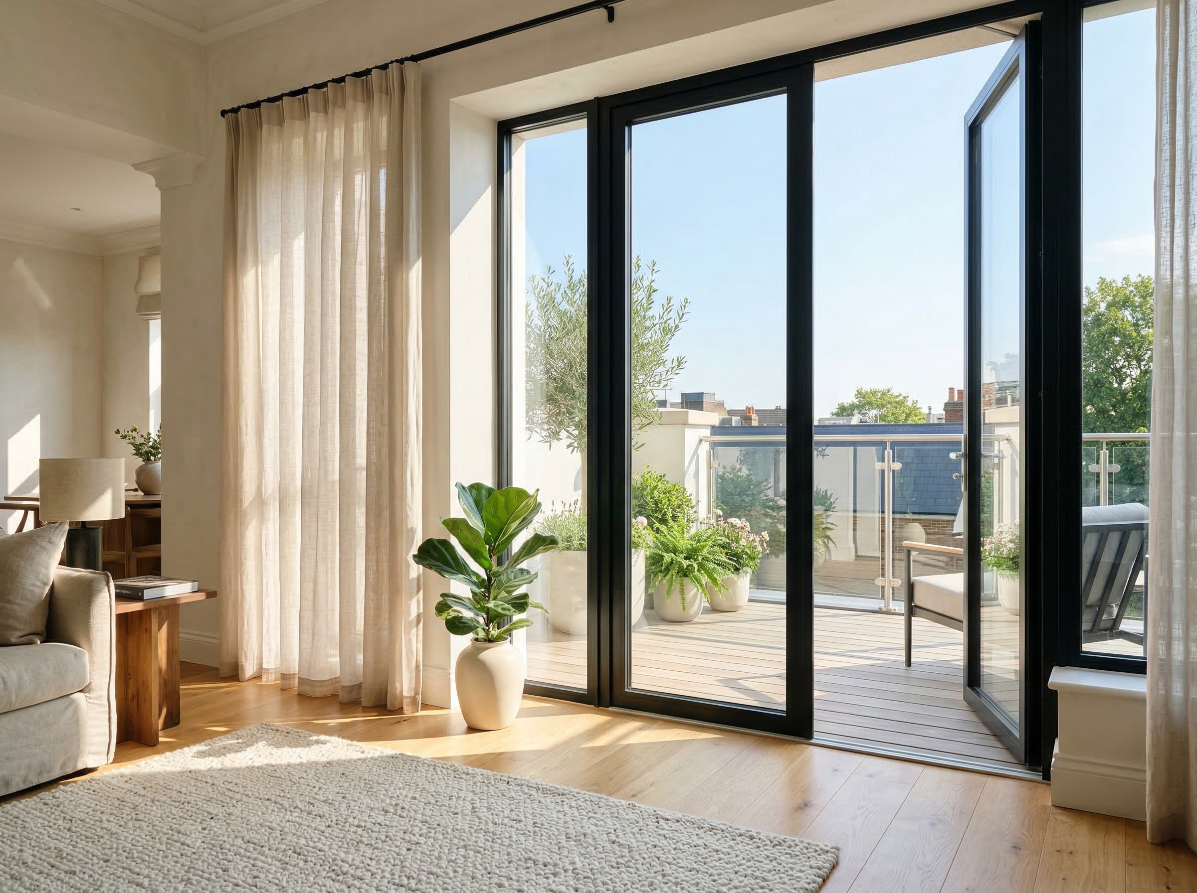 - с отдельной дверью. Створки, закрывающие дверной проем, не связаны напрямую с самим оконным блоком. Это хороший вариант для помещений с ограниченным пространством. Возможно использование полотен с различным вариантом заполнения, однако изготовленные лишь из стеклопакета двери могут оказаться неприемлемыми в некоторых ситуациях. Так, повышенная травмоопасность делает такой вариант неподходящим для семей с маленькими детьми;